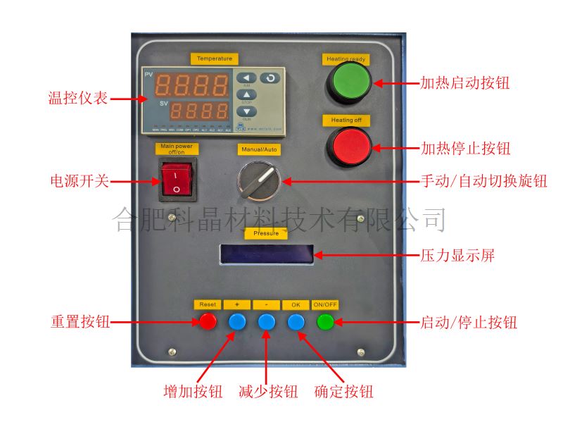 | 压力控制系统 | ·标配为电动无油压机,可选配手动油压机或电动油压机 ·压机行程:35mm ·压力显示范围:1.00-5000.00kg ·压力控制范围:30-5000Kg ·保压时间:1-9999min ·设备有两种工作模式:手动加压和自动加压。自动加压模式下设备带有恒压功能:当压力值达到目标值后,在保压的过程中,设备持续补压使压力保持在设定值。恒压精度:±3kg ·在手动模式下通过操作压机面板上的按钮,实现加压泄压过程 |