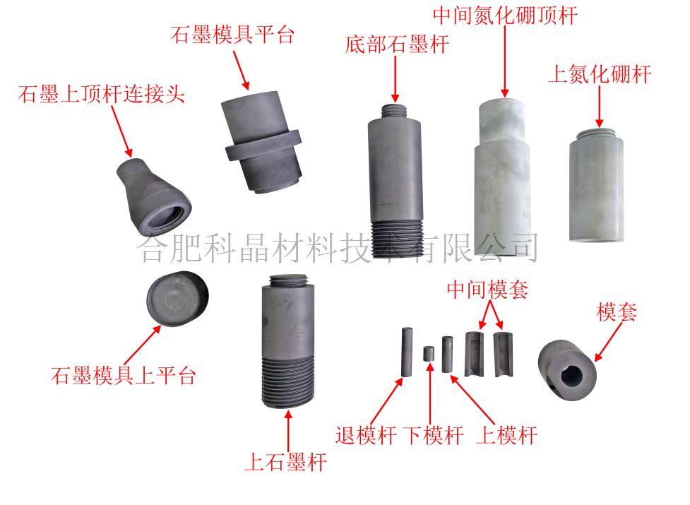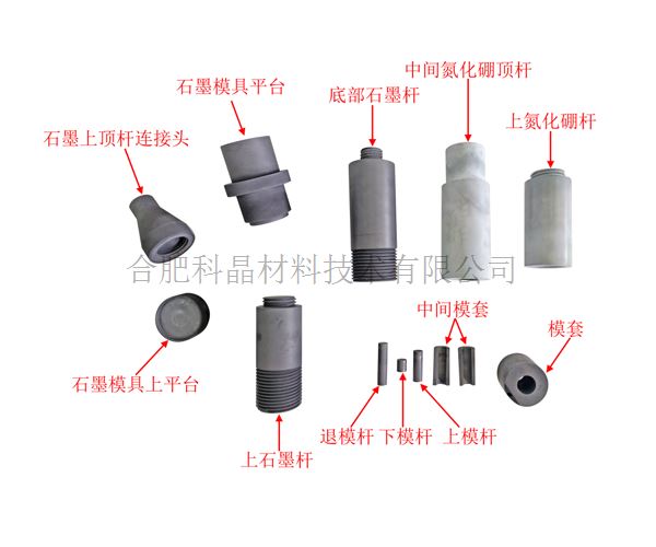 | 高温石墨热压模具 | ·2个石墨支撑杆安装在不锈钢腔室的上下盖板处 ·标配一1/2″的石墨模具(最大承压压强为100MPa) ·注:石墨模具是易耗品,可在本公司订购各种尺寸的石墨模具,此设备最大可选配1″石墨模具 ·配有云母片,用于调节模具放置高度,同时也起到石墨支撑杆和法兰之间的绝热作用 ·注:标准石墨模具能承受的最大压强为70MPa,对样品加压时,请根据模具尺寸来确定最大压力(如:对于1/2英寸石墨模具,不能超过最大可承受压力) |